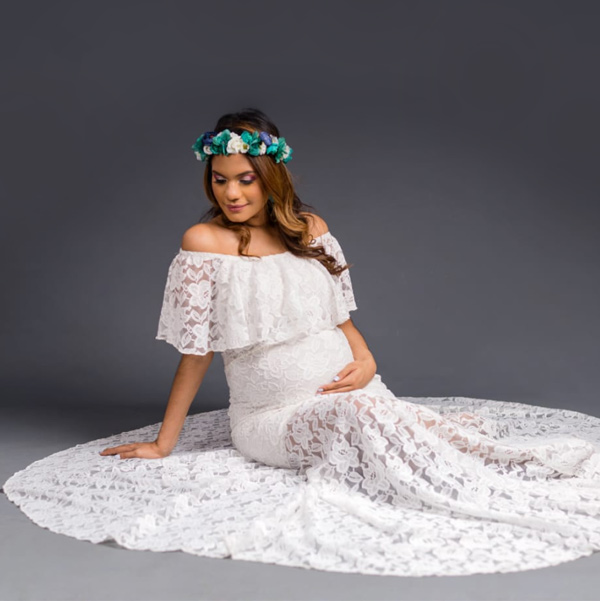 Vestido blanco forrado en encaje, ceñido al cuerpo con hombros afuera.